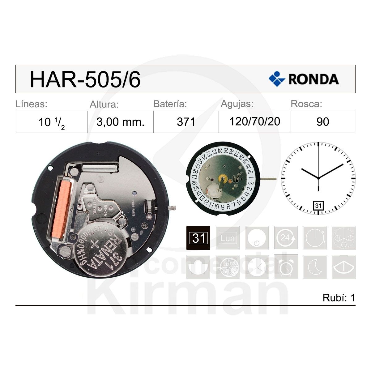 Movimiento Reloj Ronda Cuarzo HAR-505/6 Calendario 6H