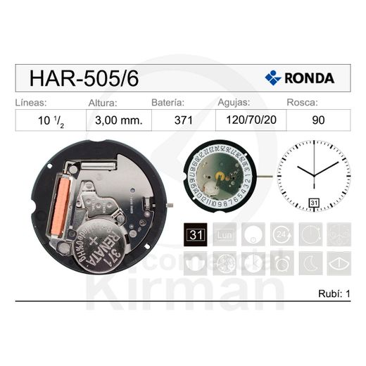 Movimiento Reloj Ronda Cuarzo HAR-505/6 Calendario 6H. Movimiento de reloj fabricado en cuarzo Bateria 371 con 1 rubí. Diseño de HAR-505/6 con segundero central, calendario a las 6H. Producto de excelente calidad, con garantía contrastada que asegura su fiabilidad y durabilidad. Ref HAR-505/6