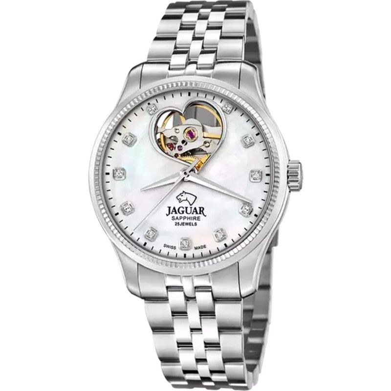 Reloj Jaguar Mujer J994/1 Acero Coeur. Caja de acero inoxidable 316I de 34mm de diametro y 10,79mm de grosor. Bisel de acero inoxidable 316I. Brazalete de acero inoxidable 316I de 16,8mm de ancho. Cierre oculto. Esfera blanca nacarada con circonitas. Swiss made. Cristal zafiro. Movimiento automático P024bv-003h1 con 25 jewels. Sumergible 50m. 3 años de garantía. Ref J994/1