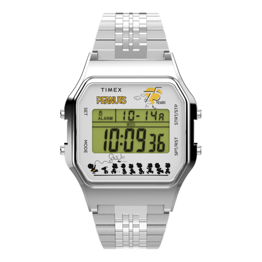 Reloj Timex Hombre TW2Y20000 Peanuts Edición Limitada Digital. Caja de latón de 34mm de diámetro. Bisel plateado. Brazalete de acero inoxidable plateado. Cierre desplegable. Esfera plateada. Multifunción, funciones digitales. Cristal acrílico. Movimiento quartz. Sumergible 30m. Edición limitada. 3 años de garantía. Ref TW2Y20000